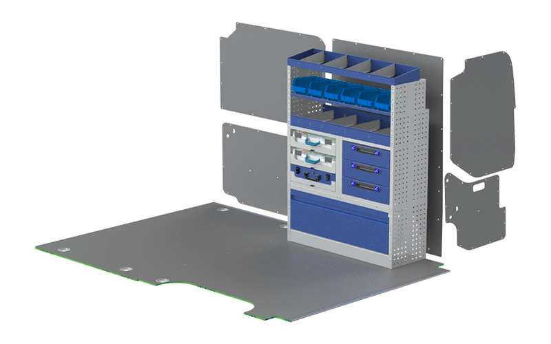 Das CONFORT-Regal, das wir für die Linksaufstellung Ihres L3H2 konzipiert haben, beinhaltet: Radhausabdeckung mit Schließtür und Kofferstopp-Set, vier Einlegeböden mit Trennwänden, 3 Schubladen, zwei Einlegeböden mit herausnehmbaren Behältern und Abschlussböden mit Trennwänden. Ideal für Installateure, die Beschläge, Schrauben, Ersatzteile und diverses Zubehör transportieren müssen.